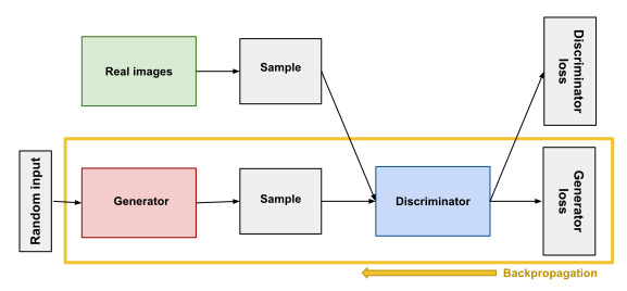 - 생성기 (Generator): 실제 데이터와 유사한 데이터를 생성하는 방법을 학습합니다. 생성기는 무작위로 입력된 노이즈 (random input)를 기반으로 점차적으로 실제 데이터와 구별할 수 없을 정도로 유사한 데이터를 만들어냅니다.