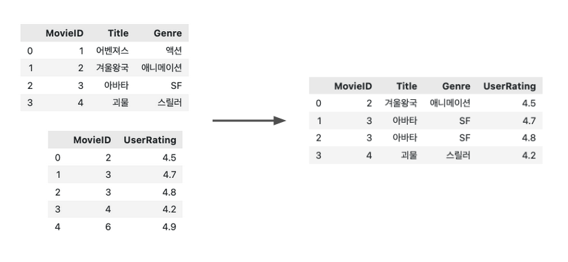 만약 두 데이터프레임들이 동일한 열 이름이 없고 이름이 다르다면 left_on과 right_on을 사용해서 병합가능하다. (예를 들어, 한 데이터프레임은 MovieID인 반면 다른 데이터프레임은 ID일 경우: pd.merge(df1, df2, left_on="MovieID", right_on="ID", how="outer")