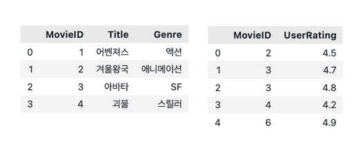 첫 번째 데이터프레임은 영화의 ID, 제목, 장르 정보를 담고 있고, 두 번째 데이터프레임은 영화 ID와 사용자 평점을 포함하고 있다.