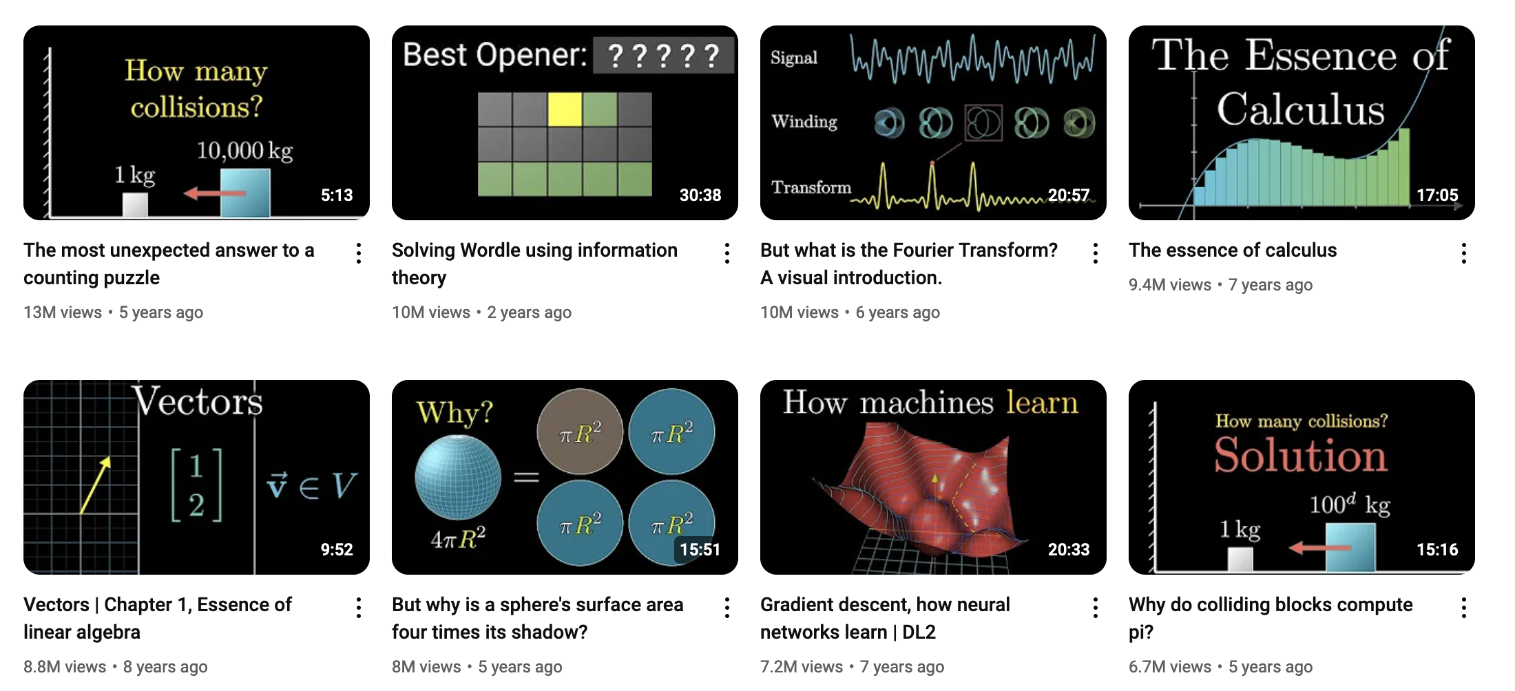 - 3Blue1Brown(유튜브/무료): 선형대수와 미적분을 시각적으로 표현해 주는 유튜브 채널. 좀 이해가 안 간다 싶은 토픽이 있으면 여기서 시각적으로 설명된 영상을 보면 이해가 빠르다.