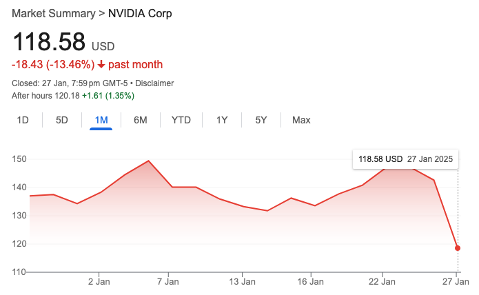 27일 엔비디아 주가가 17% 하락하며 약 5900억 달러의 시장 가치를 잃었다. 이는 미국 증시 역사상 최대 규모의 하루 손실 기록이라고 한다. 이 하락은 중국 AI 스타트업 딥시크(DeepSeek)가 낮은 비용으로 경쟁력 있는 AI 모델을 제공한다는 우려에서 비롯되었다고 한다.