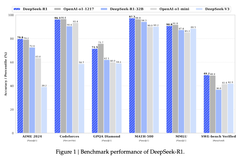 지난주 공개된 DeepSeek R1 모델은 OpenAI나 Meta의 모델에 비해 개발 및 훈련 비용이 훨씬 저렴한 것으로 알려졌다. 수학적 작업(AIME 2024), 일반 지식(MMLU), 질의응답(AlpacaEval 2.0) 등 주요 벤치마크에서 경쟁 모델과 동등하거나 더 우수한 성능을 보여주고 있다.